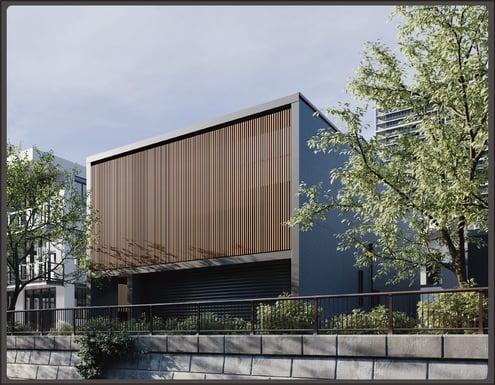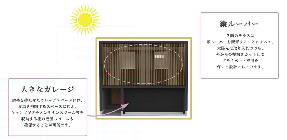 大きなビルトインガレージと、その屋根部分を活かした2階のテラスが特徴の家です。