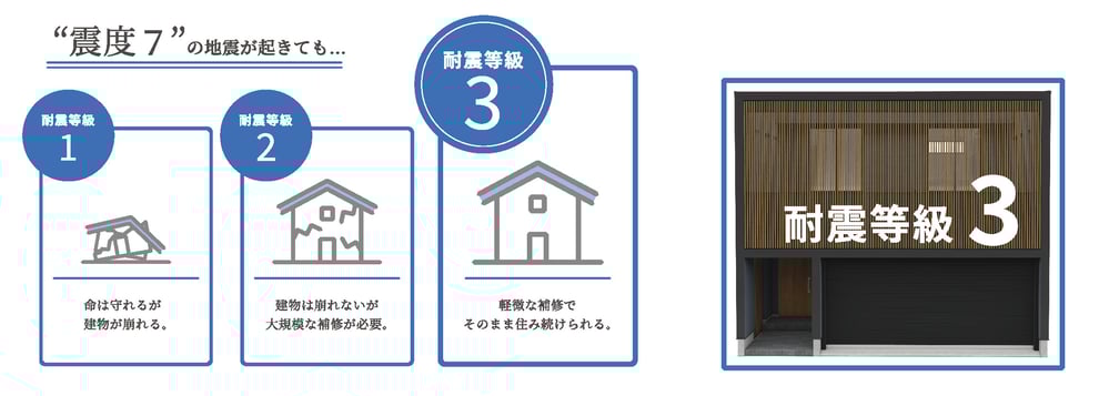 しかも、計算の基準は木構造における最も厳しい基準「耐震等級3」で計算しており、これは震度6強〜7の地震でも軽い補修で住み続けられるレベルです。