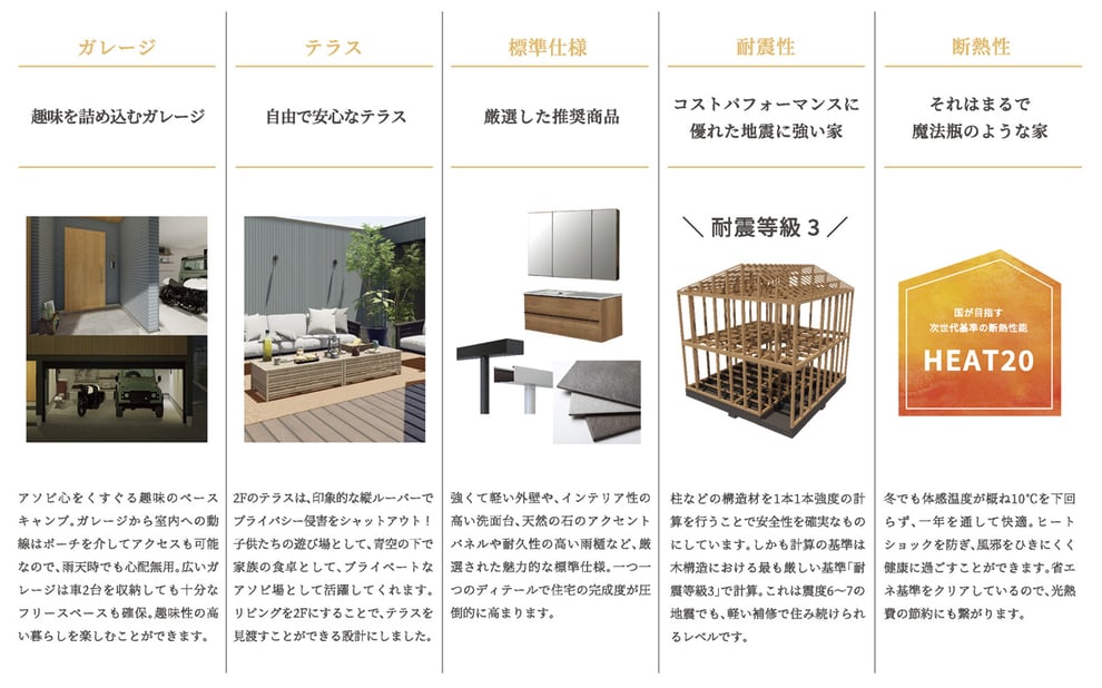 耐久の家 | シンプルな平屋の家 | 断熱の家 | 狭小の家 | ビルトインガレージの家 | 自由な箱の家 | 未来を創るZEHの家