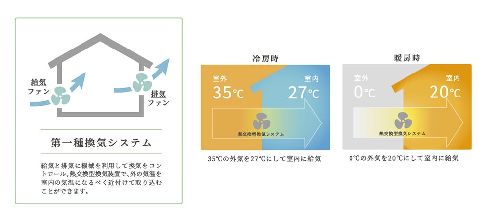 窓を開けずに新鮮な空気を取り込める「第一種換気システム」を計画的に設置し、室内の隅まできれいな空気を行き渡らせることができます。