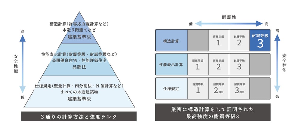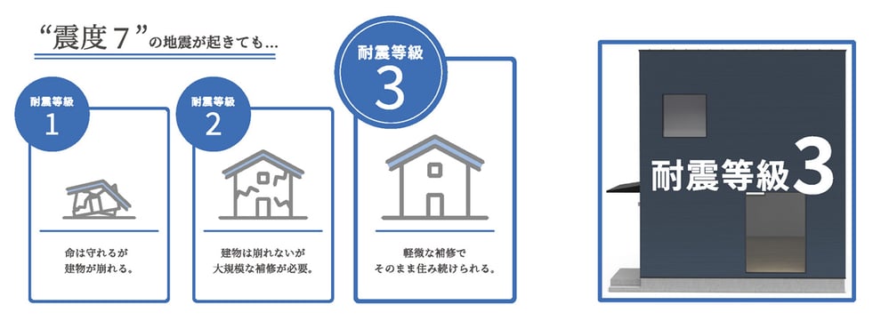 しかも、計算の基準は木構造における最も厳しい基準「耐震等級3」で計算しており、これは震度6強〜7の地震でも軽い補修で住み続けられるレベルです。