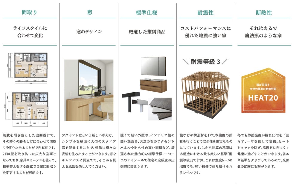 耐久の家 | シンプルな平屋の家 | 断熱の家 | 狭小の家 | ビルトインガレージの家 | 自由な箱の家 | 未来を創るZEHの家