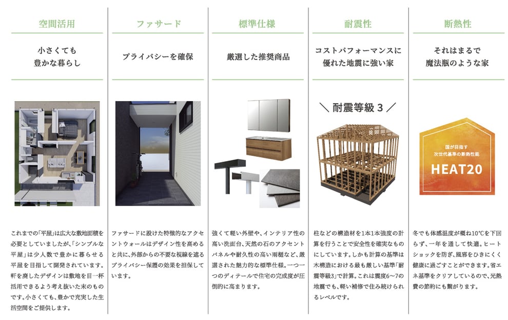 耐久の家 | シンプルな平屋の家 | 断熱の家 | 狭小の家 | ビルトインガレージの家 | 自由な箱の家 | 未来を創るZEHの家