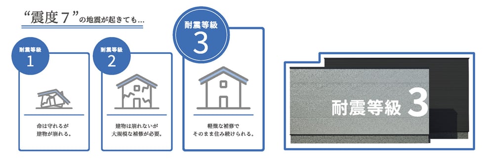しかも、計算の基準は木構造における最も厳しい基準「耐震等級3」で計算しており、これは震度6強〜7の地震でも軽い補修で住み続けられるレベルです。